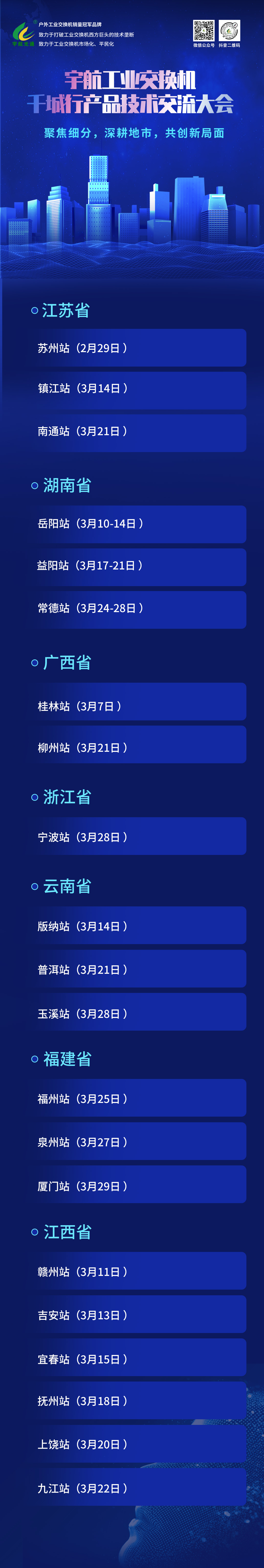 三月,宇航將攜手眾多合作伙伴和宇航全國(guó)產(chǎn)工業(yè)交換機(jī),在濟(jì)南、西安、鄭州、合肥、武漢等地參展,與各界朋友共襄盛舉。同時(shí),宇航還將深入江蘇、湖南、廣西、浙江、云南、福建、江西等地,舉行宇航工業(yè)交換機(jī)千城行產(chǎn)品技術(shù)交流大會(huì),助力各行各業(yè)的數(shù)字化轉(zhuǎn)型,讓數(shù)字化轉(zhuǎn)型的春風(fēng),吹滿神州大地!