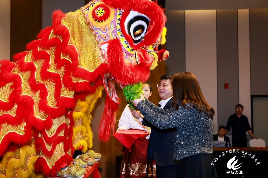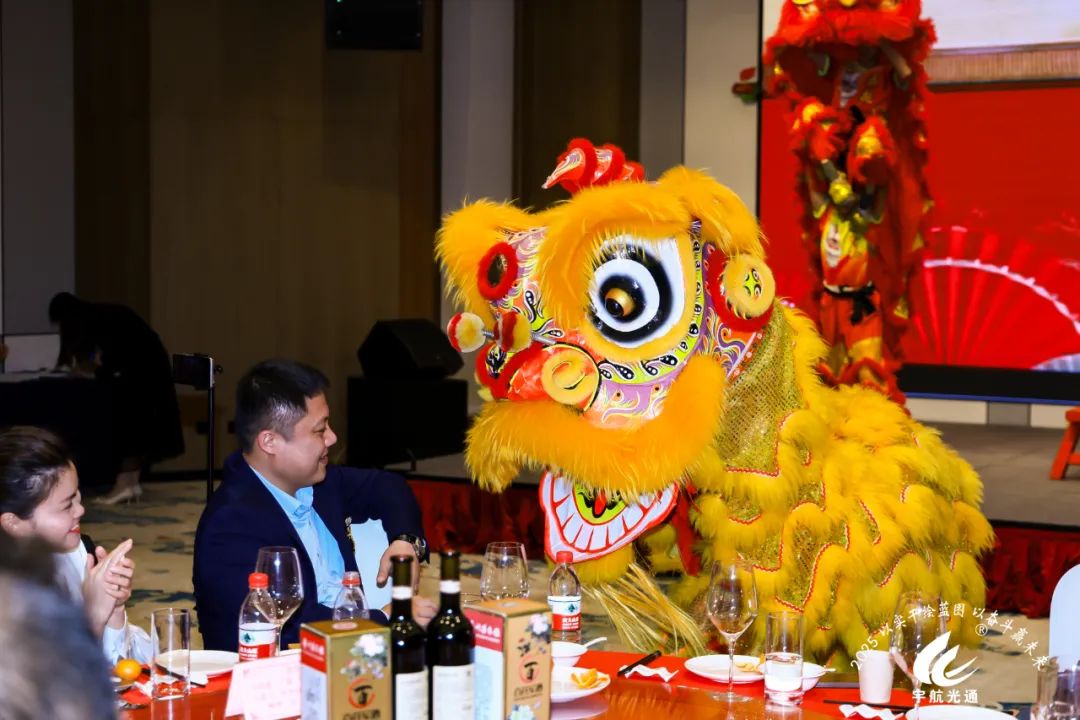 隨著劉總宣布晚宴開始,整個活動現(xiàn)場的氣氛達(dá)到了一個新的高潮。主持人以熱情洋溢的語言邀請瑞獅上臺,無疑為晚宴增添了一抹獨特的文化色彩。張總親自進(jìn)行點睛之筆,為瑞獅點上慧眼,寓意著喚醒獅子的靈氣,帶來吉祥和好運。緊接著,劉總和董總上臺進(jìn)行采青儀式。采青是舞獅活動中重要的部分,象征著生意興隆、財源廣進(jìn)。最后三位領(lǐng)導(dǎo)人和獅子進(jìn)行了合影留念。