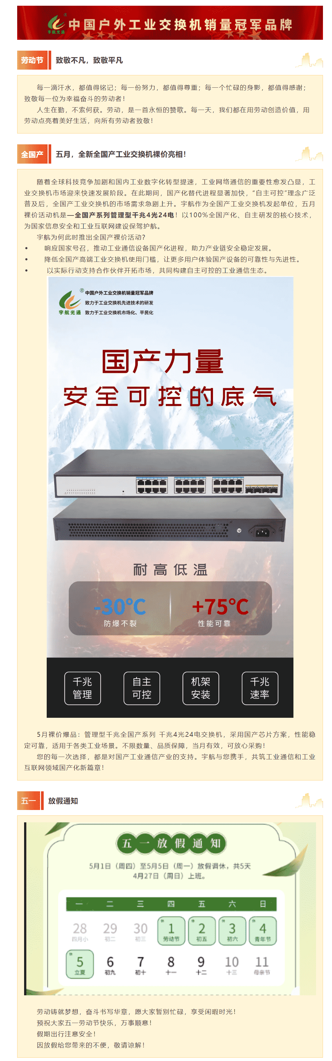 勞動節(jié),用勞動點亮美好生活!宇航全新全國產(chǎn)工業(yè)交換機五月裸價提前赴約!