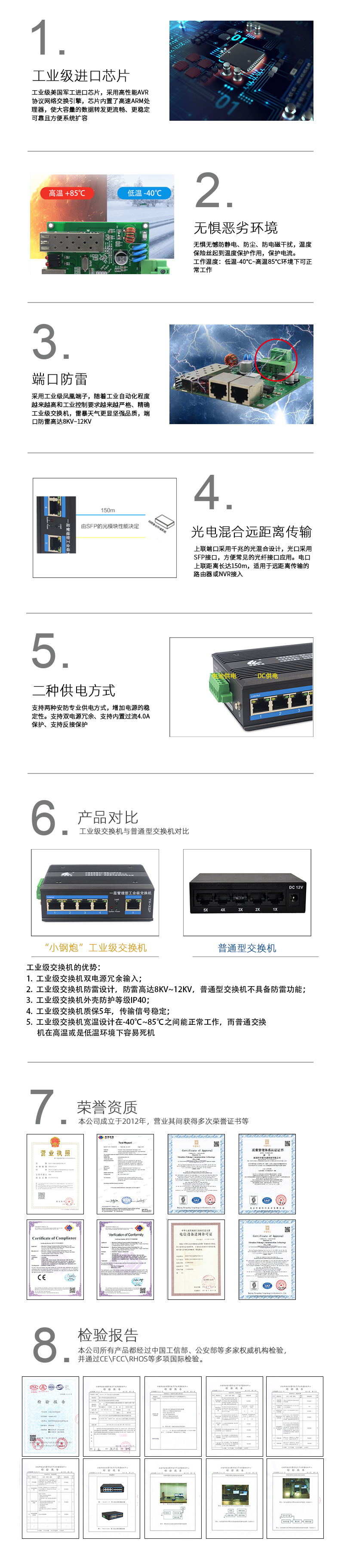 1個百兆光+4個百兆電、SC接口、多模雙纖、2公里、導軌式、DC12-52V供電-寬溫(-40℃-85℃)-CE-RoHS-FCC-公安部檢驗報告-工信部入網許可證 |