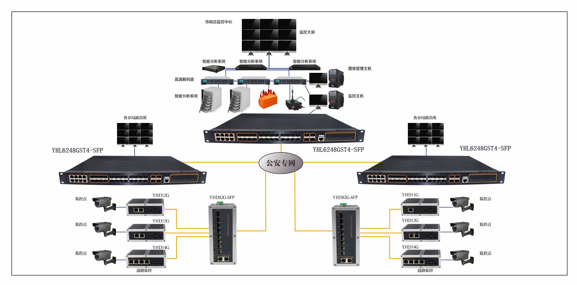 宇航在解決方案中采用YHL6248GST4-SFP, YHD28G, YHD14G,YHD12G,根據(jù)各個城市安防監(jiān)控點,安裝定點攝像機(jī),快球,解碼器,報警探頭等設(shè)備,通過光纖將視音信號匯聚到派出所光纖匯聚點,將數(shù)字視頻傳送到遠(yuǎn)程分局監(jiān)控中心, 保障各個監(jiān)控點監(jiān)控到位,提高網(wǎng)絡(luò)數(shù)據(jù)傳輸高效性。